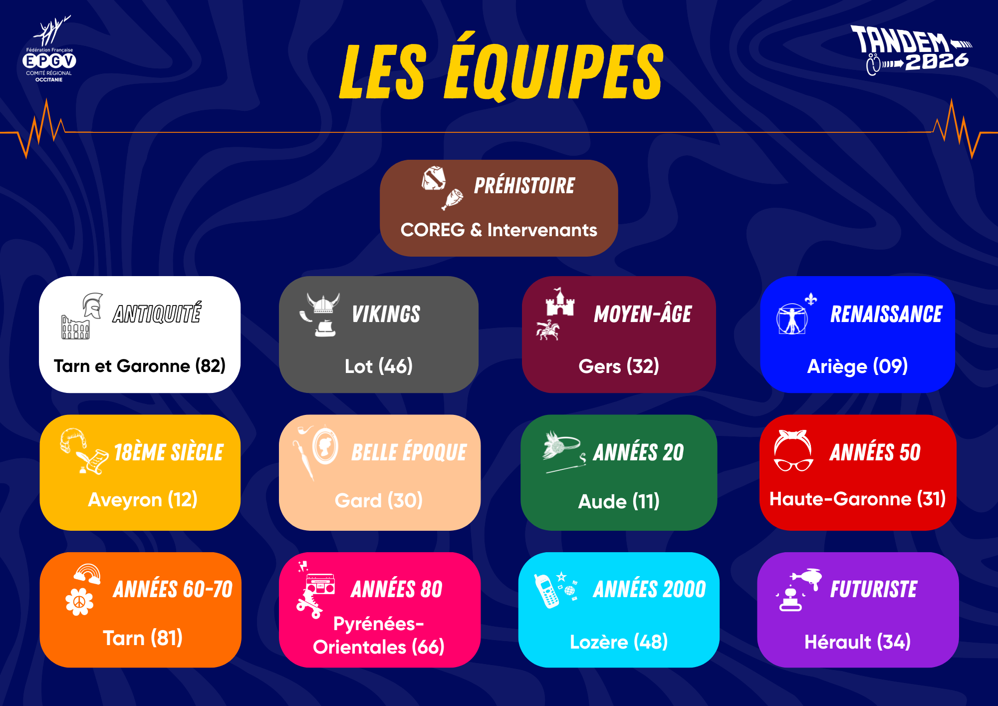Attention : Le tirage des équipes de tandem a été réalisé lors d’une réunion regroupant les différents départements d’occitanie (ctrdca). Ces équipes sont valables uniquement s’il y a minimum 6 personnes inscrites par département. Si un département a moins de 6 inscrits, il fusionnera avec un autre département. Les équipes présentées ici sont donc susceptibles de changer en fonction des inscriptions.